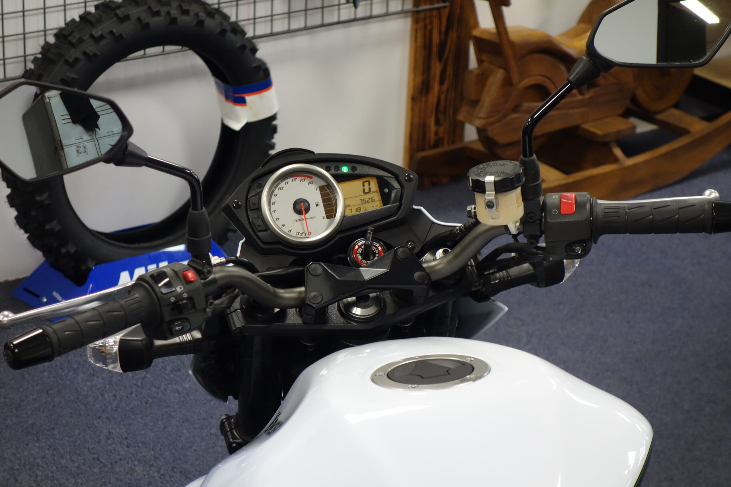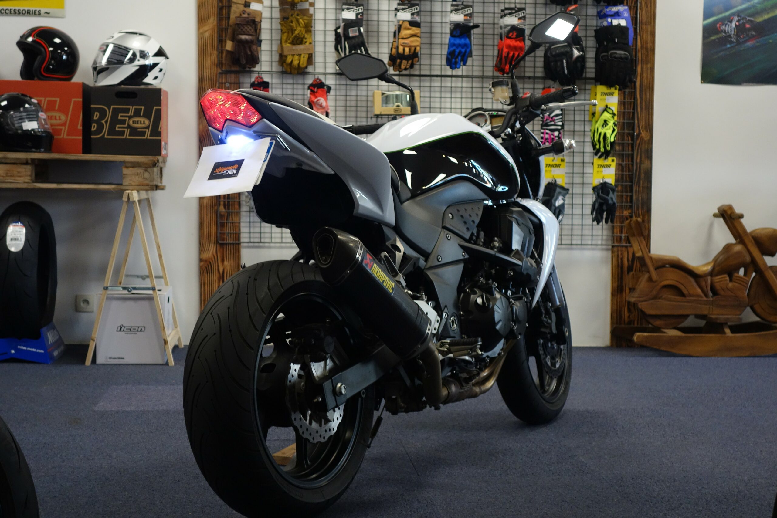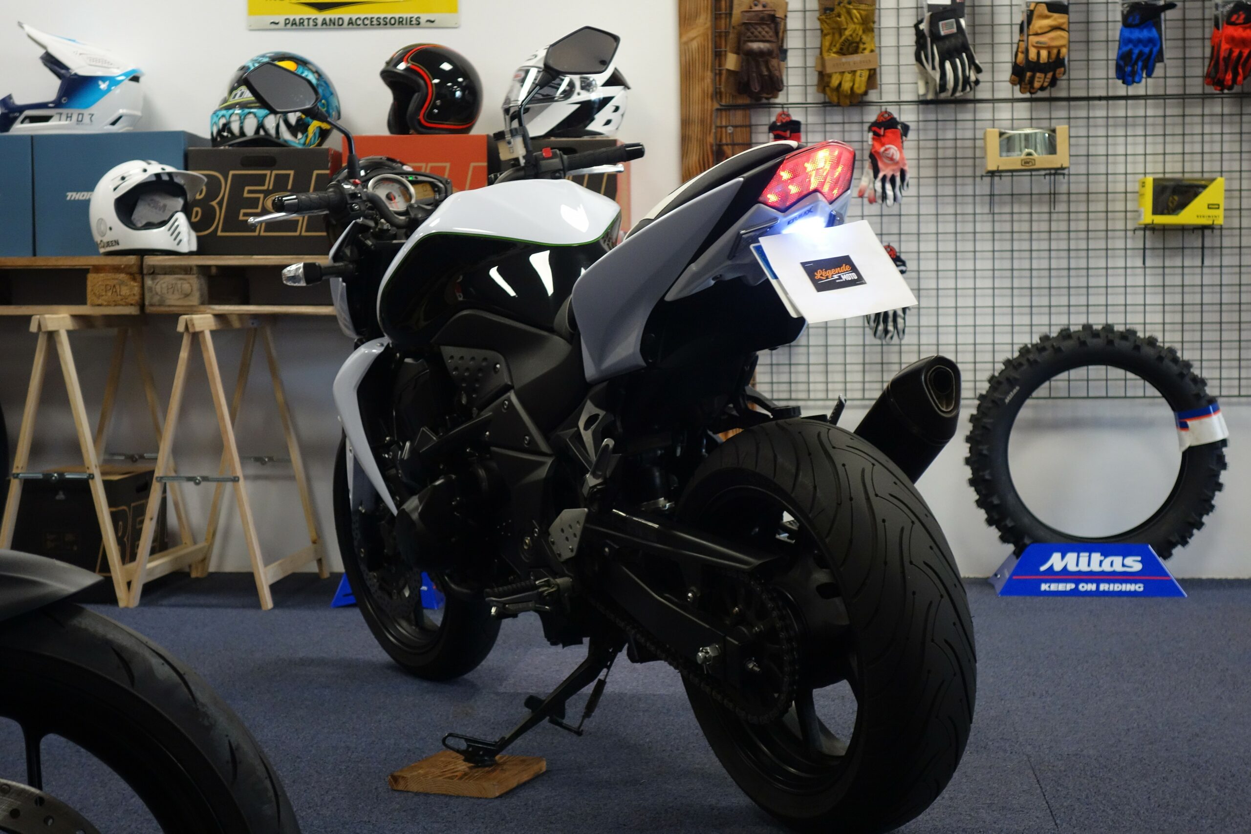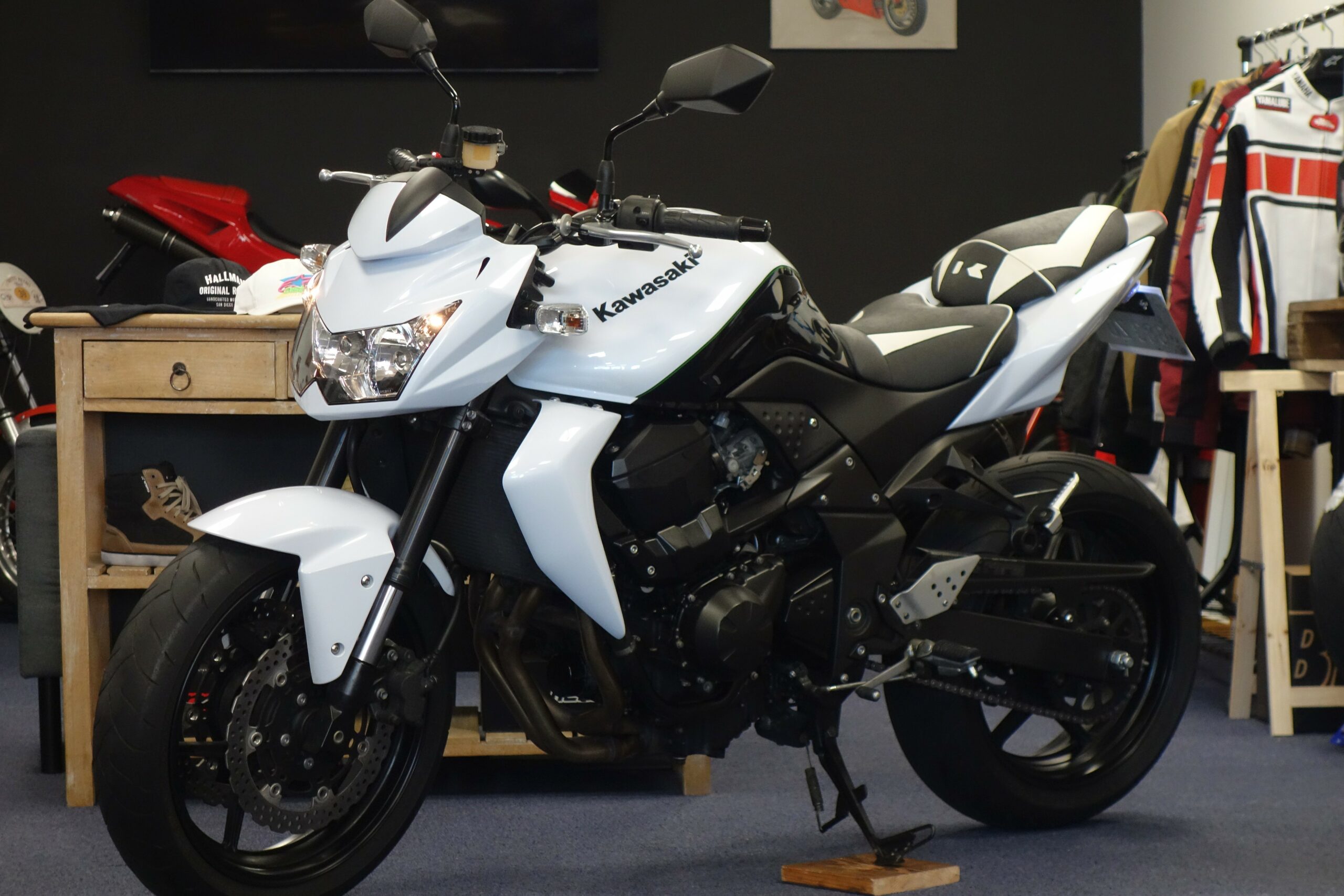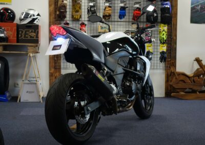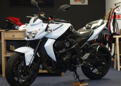 Cette Kawasaki Z750 bien optionnée est prête à prendre la route avec sa teinte bi-ton blanc métallisé.