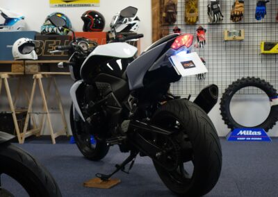Le silencieux d’origine et le support de plaquet d’origine avec les clignotants arrière seront livrés avec la moto.